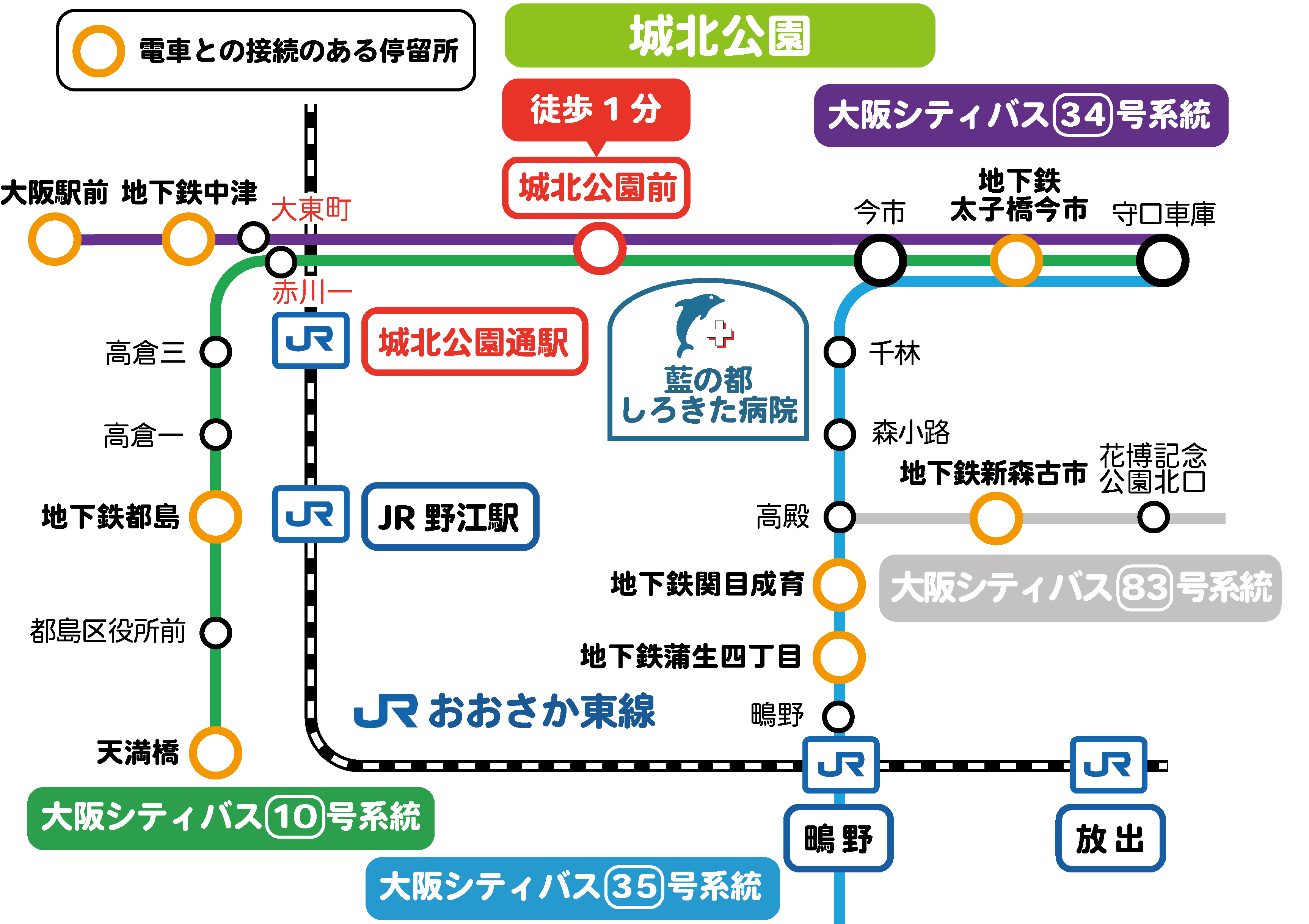 ・地下鉄太子橋今市バス停より、大阪シティバス34号大阪駅前行き、または大阪シティバス天満橋行き10号で6分。城北公園前バス停で下車徒歩1分。