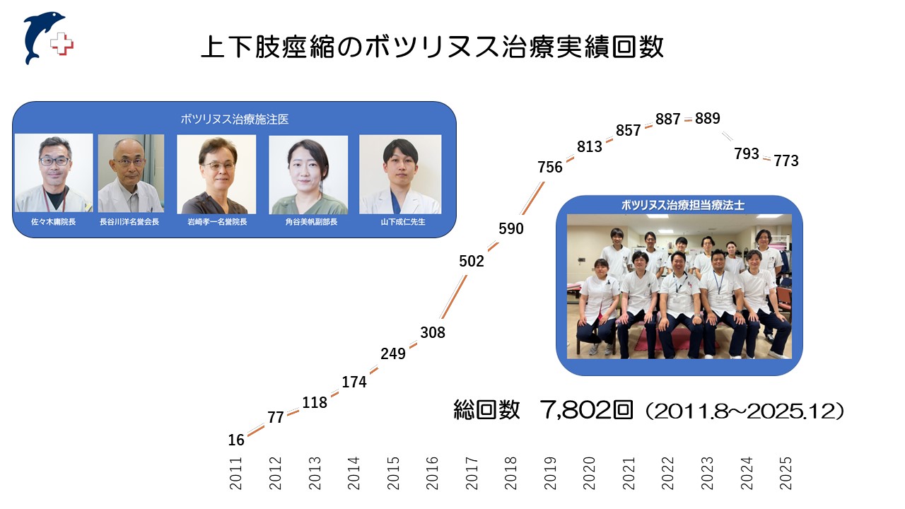 2011年~2022年12月末迄に、ボツリヌス治療を5,298回実施しており、痙縮のボツリヌス治療において名実ともに日本トップクラスの実績となっています。